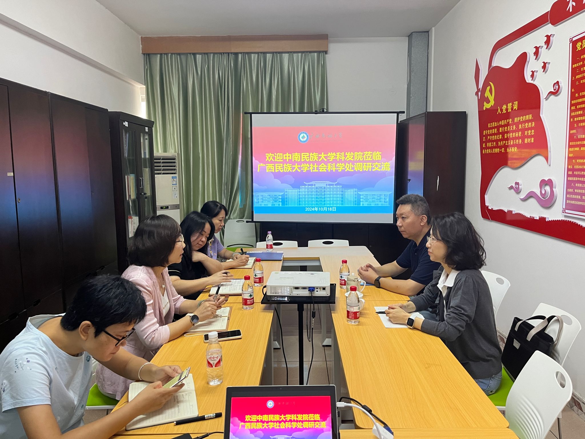 10月18日上午,中南民族大学科发院副院长李金等一行两人莅临版权所有:M88在线客服|专业客服团队,7×24小时贴心服务,就怎样推进有组织科研、如何平衡文理科之间的评价方法及进一步完善科研管理制度等方面进行了深入的交流。社科处副处长胡佳教授主持,社科处全体工作人员参加。