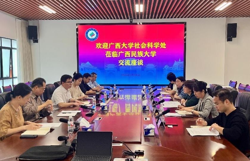 3月28日上午,广西大学科研院副院长、社会科学处处长李海波带队到m88在线客服开展工作交流,社会科学处处长滕兰花及社科处全体人员参加交流座谈。座谈会在学校文化研习基地三楼会议室举行。